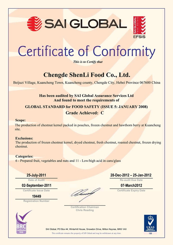 2011年7月25日我公司接受BRC專家的審核與認證,于2011年9月2號正式獲得BRC認證證書